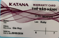 THẺ BẢO HÀNH CHÍNH HÃNG RUBY Sản phẩm / Product Katana Số thẻ / Card No. 05247297 Tên / Name Đỗ Thị Bích Phòng khám / Clinic BS Thiết Labo / Lab Ruby Số Răng R26 R36 Gía trị đến / Valid to 20/05/2034 Xuất sứ Nhật