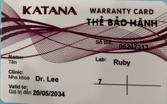 THẺ BẢO HÀNH CHÍNH HÃNG RUBY Sản phẩm / Product Katana Số thẻ / Card No. 05247313 Tên / Name Phòng khám / Clinic NK Dr. Lee Labo / Lab Ruby Số Răng R17 Gía trị đến / Valid to 20/05/2034 Xuất sứ Nhật