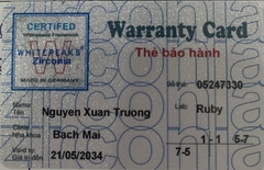 THẺ BẢO HÀNH CHÍNH HÃNG RUBY Sản phẩm / Product Ziconia Số thẻ / Card No. 05247330 Tên / Name Nguyễn Xuân Trường Phòng khám / Clinic Bạch Mai Labo / Lab Ruby Số Răng R11-21 R25-27 R45-47 Gía trị đến / Valid to 21/05/2034 Xuất sứ Nhật