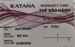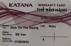 THẺ BẢO HÀNH CHÍNH HÃNG RUBY Sản phẩm / Product Katana Số thẻ / Card No. 05247326 Tên / Name Đinh Thị Thu Hương Phòng khám / Clinic BS Vân Labo / Lab Ruby Số Răng R46 Gía trị đến / Valid to 21/05/2034 Xuất sứ Nhật