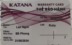 THẺ BẢO HÀNH CHÍNH HÃNG RUBY Sản phẩm / Product Katana Số thẻ / Card No. 05247317 Tên / Name Lan Ngọc Phòng khám / Clinic BS Phong Labo / Lab Ruby Số Răng R37 Gía trị đến / Valid to 21/05/2034 Xuất sứ Nhật