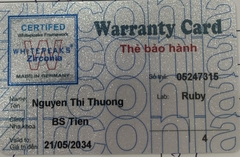 THẺ BẢO HÀNH CHÍNH HÃNG RUBY Sản phẩm / Product Ziconia Số thẻ / Card No. 05247315 Tên / Name Nguyễn Thị Thường Phòng khám / Clinic Thủy Tiên Labo / Lab Ruby Số Răng R34 Gía trị đến / Valid to 21/05/2034 Xuất sứ Nhật