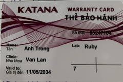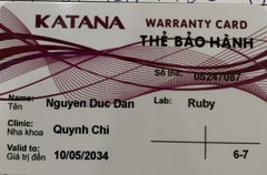 THẺ BẢO HÀNH CHÍNH HÃNG RUBY Sản phẩm / Product Katana Số thẻ / Card No. 05247087 Tên / Name Nguyễn Đức Dân Phòng khám / Clinic Quỳnh Chi Labo / Lab Ruby Số Răng R36-37 Gía trị đến / Valid to 10/05/2034 Xuất sứ Nhật