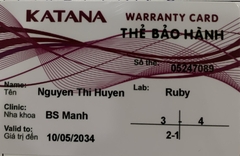 THẺ BẢO HÀNH CHÍNH HÃNG RUBY Sản phẩm / Product Katana Số thẻ / Card No. 05247089 Tên / Name Nguyễn Thị Huyền Phòng khám / Clinic BS Mạnh Labo / Lab Ruby Số Răng R13-24 R41-42 Gía trị đến / Valid to 10/05/2034 Xuất sứ Nhật