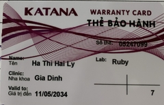 THẺ BẢO HÀNH CHÍNH HÃNG RUBY Sản phẩm / Product Katana Số thẻ / Card No. 05247099 Tên / Name Hà Thị Hải Lý Phòng khám / Clinic Gia Đình Labo / Lab Ruby Số Răng R37 Gía trị đến / Valid to 11/05/2034 Xuất sứ Nhật