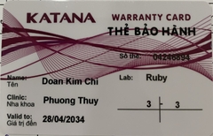 THẺ BẢO HÀNH CHÍNH HÃNG RUBY Sản phẩm / Product Katana Số thẻ / Card No. 04246894 Tên / Name Đoàn Kim Chi Phòng khám / Clinic Phương Thúy Labo / Lab Ruby Số Răng R13-23 Gía trị đến / Valid to 28/04/2034 Xuất sứ Nhật