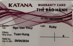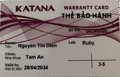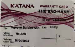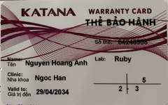 THẺ BẢO HÀNH CHÍNH HÃNG RUBY Sản phẩm / Product Katana Số thẻ / Card No. 04246908 Tên / Name Nguyễn Hoàng Anh Phòng khám / Clinic Ngọc Hân Labo / Lab Ruby Số Răng R25 R33-42 Gía trị đến / Valid to 29/04/2034 Xuất sứ Nhật