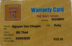 THẺ BẢO HÀNH CHÍNH HÃNG RUBY Sản phẩm / Product Tital Số thẻ / Card No. 04246809 Tên / Name Nguyễn Văn Chuyền Phòng khám / Clinic BS Thiết Labo / Lab Ruby Số Răng R22-26 Gía trị đến / Valid to 24/04/2034 Xuất sứ Mỹ