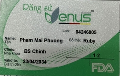 THẺ BẢO HÀNH CHÍNH HÃNG RUBY Sản phẩm / Product Venus Số thẻ / Card No. 04246805 Tên / Name Phạm Mai Phương Phòng khám / Clinic BS Chinh Labo / Lab Ruby Số Răng R21-22 Gía trị đến / Valid to 23/04/2034 Xuất sứ Đức