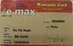 THẺ BẢO HÀNH CHÍNH HÃNG RUBY Sản phẩm / Product Emax Số thẻ / Card No. 04246804 Tên / Name Vũ Thị Xuân Phòng khám / Clinic BS Chinh Labo / Lab Ruby Số Răng R32-42 Gía trị đến / Valid to 23/04/2034 Xuất sứ Đức
