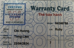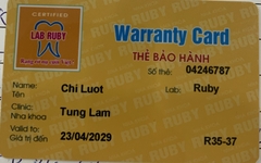 THẺ BẢO HÀNH CHÍNH HÃNG RUBY Sản phẩm / Product Tital Số thẻ / Card No. 04246766 Tên / Name Nguyễn Thị Mơ Phòng khám / Clinic NK Tuấn Hùng Labo / Lab Ruby Số Răng R22 Gía trị đến / Valid to 23/04/2034 Xuất sứ Đức