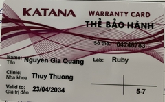 THẺ BẢO HÀNH CHÍNH HÃNG RUBY Sản phẩm / Product Katana Số thẻ / Card No. 04246783 Tên / Name Nguyễn Gia Quảng Phòng khám / Clinic NK Thúy Thưởng Labo / Lab Ruby Số Răng R35-37 Gía trị đến / Valid to 23/04/2034 Xuất sứ Nhật
