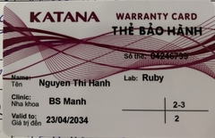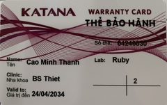 THẺ BẢO HÀNH CHÍNH HÃNG RUBY Sản phẩm / Product Katana Số thẻ / Card No. 04246830 Tên / Name Cao Minh Thành Phòng khám / Clinic BS Thiết Labo / Lab Ruby Số Răng R22 Gía trị đến / Valid to 24/04/2034 Xuất sứ Nhật