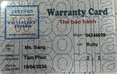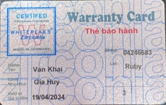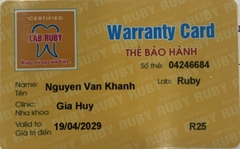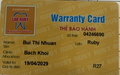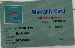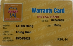 THẺ BẢO HÀNH CHÍNH HÃNG RUBY Sản phẩm / Product Ziconia Số thẻ / Card No. 04246699 Tên / Name Ms. Sang Phòng khám / Clinic BS Tuấn ( Tâm Phúc ) Labo / Lab Ruby Số Răng R12-22 Gía trị đến / Valid...