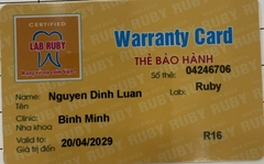 THẺ BẢO HÀNH CHÍNH HÃNG RUBY Sản phẩm / Product Tital Số thẻ / Card No. 04246706 Tên / Name Nguyễn Đình Luân Phòng khám / Clinic NK Bình Minh Tuyên Quang Labo / Lab Ruby Số Răng R16 Gía trị đến / Valid...