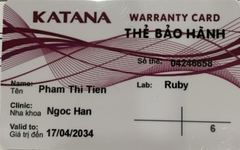 THẺ BẢO HÀNH CHÍNH HÃNG RUBY Sản phẩm / Product Katana Số thẻ / Card No. 04246658 Tên / Name Phạm Thị Tiền Phòng khám / Clinic NK Ngọc Hân Labo / Lab Ruby Số Răng R36 Gía trị đến / Valid to 17/04/2034 Xuất sứ Nhật