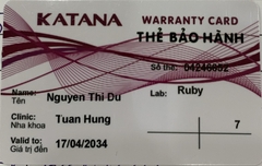 THẺ BẢO HÀNH CHÍNH HÃNG RUBY Sản phẩm / Product Katana Số thẻ / Card No. 04246652 Tên / Name Nguyễn Thị Dự Phòng khám / Clinic NK Tuấn Hùng Labo / Lab Ruby Số Răng R27 Gía trị đến / Valid to 17/04/2034 Xuất sứ Nhật
