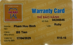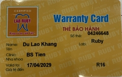 THẺ BẢO HÀNH CHÍNH HÃNG RUBY Sản phẩm / Product Tital Số thẻ / Card No. 04246646 Tên / Name Phạm Hữu Bình Phòng khám / Clinic BS Tiên Labo / Lab Ruby Số Răng R15-16 Gía trị đến / Valid to 17/04/2034 Xuất sứ Nhật