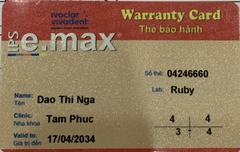 THẺ BẢO HÀNH CHÍNH HÃNG RUBY Sản phẩm / Product Emax Số thẻ / Card No. 04246660 Tên / Name Đào Thị Ngà Phòng khám / Clinic NK Tâm Phúc (BS Tuấn) Labo / Lab Ruby Số Răng R14, 24, 34-43 Gía trị đến...