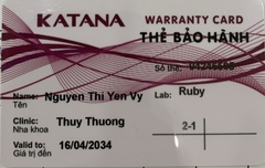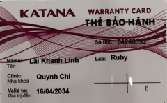 THẺ BẢO HÀNH CHÍNH HÃNG RUBY Sản phẩm / Product Katana Số thẻ / Card No. 04246601 Tên / Name Thảo Phòng khám / Clinic NK Phương Thúy Labo / Lab Ruby Số Răng R27 Gía trị đến / Valid to 16/04/2034 Xuất sứ Nhật