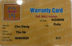 THẺ BẢO HÀNH CHÍNH HÃNG RUBY Sản phẩm / Product Tital Số thẻ / Card No. 04246598 Tên / Name Chú Siêng Phòng khám / Clinic NK Thu Hà Labo / Lab Ruby Số Răng R17 Gía trị đến / Valid to 16/04/2029 Xuất sứ Nhật