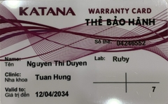 THẺ BẢO HÀNH CHÍNH HÃNG RUBY Sản phẩm / Product Katana Số thẻ / Card No. 04246569 Tên / Name Nguyễn Hữu Định Phòng khám / Clinic Tuấn Hùng Labo / Lab Ruby Số Răng R13-23 Gía trị đến / Valid to 12/04/2034 Xuất sứ Nhật