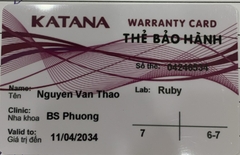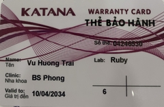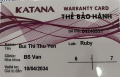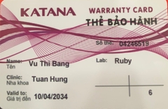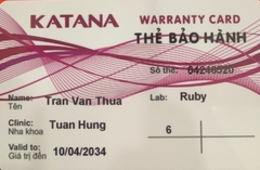THẺ BẢO HÀNH CHÍNH HÃNG RUBY Sản phẩm / Product Katana Số thẻ / Card No. 04246531 Tên / Name Bùi Thị Thu Yến Phòng khám / Clinic BS Vân Trung Văn Labo / Lab Ruby Số Răng R16-27 Gía trị đến / Valid...
