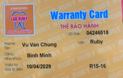 THẺ BẢO HÀNH CHÍNH HÃNG RUBY Sản phẩm / Product Tital Số thẻ / Card No. 04246518 Tên / Name Vũ Văn Chung Phòng khám / Clinic Bình Minh Labo / Lab Ruby Số Răng R15-16 Gía trị đến / Valid to 10/04/2034 Xuất sứ Nhật