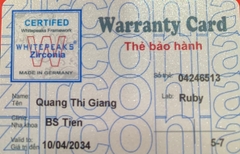 THẺ BẢO HÀNH CHÍNH HÃNG RUBY Sản phẩm / Product Ziconia Số thẻ / Card No. 04246462 Tên / Name Trần Thị Hương Phòng khám / Clinic Quỳnh Chi Labo / Lab Ruby Số Răng R43 Gía trị đến / Valid to 08/04/2034 Xuất sứ Nhật
