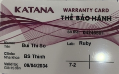 THẺ BẢO HÀNH CHÍNH HÃNG RUBY Sản phẩm / Product Katana Số thẻ / Card No. 04246501 Tên / Name Bùi Thị Sơ Phòng khám / Clinic BS Thịnh (Ruby Thái Bình) Labo / Lab Ruby Số Răng R47-42 Gía trị đến / Valid...