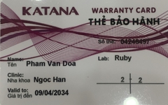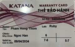 THẺ BẢO HÀNH CHÍNH HÃNG RUBY Sản phẩm / Product Katana Số thẻ / Card No. 04246498 Tên / Name Phạm Hồng Thơm Phòng khám / Clinic NK Ngọc Hân Labo / Lab Ruby Số Răng R16, R35-37, R45-47 Gía trị đến / Valid...
