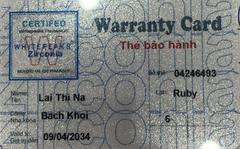 THẺ BẢO HÀNH CHÍNH HÃNG RUBY Sản phẩm / Product Ziconia Số thẻ / Card No. 04246493 Tên / Name Lại Thị Na Phòng khám / Clinic Bách Khôi Labo / Lab Ruby Số Răng R16 Gía trị đến / Valid to 09/04/2034 Xuất sứ Nhật