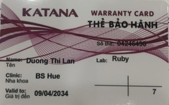THẺ BẢO HÀNH CHÍNH HÃNG RUBY Sản phẩm / Product Katana Số thẻ / Card No. 04246497 Tên / Name Phạm Văn Đóa Phòng khám / Clinic NK Ngọc Hân Labo / Lab Ruby Số Răng R12-22 Gía trị đến / Valid to 09/04/2034 Xuất sứ Nhật