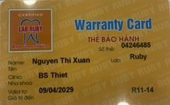 THẺ BẢO HÀNH CHÍNH HÃNG RUBY Sản phẩm / Product Ziconia Số thẻ / Card No. 04246494 Tên / Name Nguyễn Quang Đại Phòng khám / Clinic Bạch Mai Labo / Lab Ruby Số Răng R25 Gía trị đến / Valid to 09/04/2034 Xuất sứ Nhật