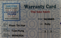 THẺ BẢO HÀNH CHÍNH HÃNG RUBY Sản phẩm / Product Ziconia Số thẻ / Card No. 04246405 Tên / Name Phạm Thị Huệ Phòng khám / Clinic Tuấn Hùng Labo / Lab Ruby Số Răng R13-23 Gía trị đến / Valid to 05/04/2034 Xuất sứ Nhật