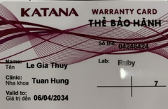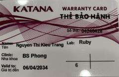 THẺ BẢO HÀNH CHÍNH HÃNG RUBY Sản phẩm / Product Katana Số thẻ / Card No. 04246428 Tên / Name Nguyễn Thị Kiều Trang Phòng khám / Clinic BS Phong 16A Labo / Lab Ruby Số Răng R36 Gía trị đến / Valid to 06/04/2034 Xuất...