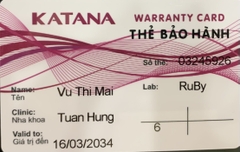 THẺ BẢO HÀNH CHÍNH HÃNG RUBY Sản phẩm / Product Katana Số thẻ / Card No. 03245926 Tên / Name Vũ Thị Mai Phòng khám / Clinic NK Tuấn Hùng Labo / Lab Ruby Số Răng R46 Gía trị đến / Valid to 16/03/2034 Xuất sứ Nhật