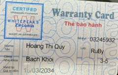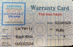 THẺ BẢO HÀNH CHÍNH HÃNG RUBY Sản phẩm / Product Ziconia Số thẻ / Card No. 03245932 Tên / Name Hoàng T. Quý Phòng khám / Clinic NK Bách Khôi Labo / Lab Ruby Số Răng R24 Gía trị đến / Valid to 16/03/2034 Xuất sứ Đức
