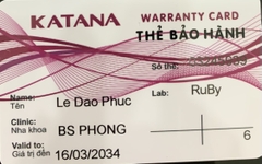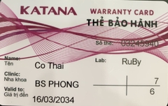 THẺ BẢO HÀNH CHÍNH HÃNG RUBY Sản phẩm / Product KatanaFull Số thẻ / Card No. 03245940 Tên / Name Cô Thái Phòng khám / Clinic BS Phong 16A Labo / Lab Ruby Số Răng R27,36 Gía trị đến / Valid to 16/03/2034 Xuất sứ Nhật