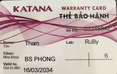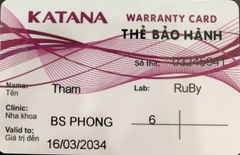 THẺ BẢO HÀNH CHÍNH HÃNG RUBY Sản phẩm / Product Katana Số thẻ / Card No. 03245941 Tên / Name Thắm Phòng khám / Clinic BS Phong 16A Labo / Lab Ruby Số Răng R16 Gía trị đến / Valid to 16/03/2034 Xuất sứ Nhật