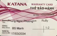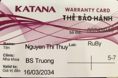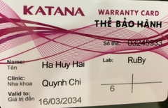 THẺ BẢO HÀNH CHÍNH HÃNG RUBY Sản phẩm / Product Katana Số th ẻ / Card No. 03245933 Tên / Name Hà Huy Hải Phòng khám / Clinic NK Quỳnh Chi Labo / Lab Ruby Số Răng R46 Gía trị đến / Valid...