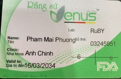 THẺ BẢO HÀNH CHÍNH HÃNG RUBY Sản phẩm / Product Venus Số thẻ / Card No. 03245951 Tên / Name Phạm Mai Phương Phòng khám / Clinic NK Anh Chinh Labo / Lab Ruby Số Răng R16,26 Gía trị đến / Valid to 16/03/2034 Xuất sứ Đức