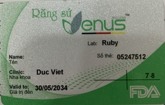 THẺ BẢO HÀNH CHÍNH HÃNG RUBY Sản phẩm / Product Venus Số thẻ / Card No. 05247512 Tên / Name Phòng khám / Clinic Đức Việt Labo / Lab Ruby Số Răng R27-28 Gía trị đến / Valid to 30/05/2034 Xuất sứ Nhật