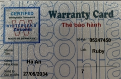 THẺ BẢO HÀNH CHÍNH HÃNG RUBY Sản phẩm / Product Ziconia Số thẻ / Card No. 05247451 Tên / Name Nguyễn Hữu Hoàng Phòng khám / Clinic Gia Đình Labo / Lab Ruby Số Răng R14 Gía trị đến / Valid to 27/05/2034 Xuất sứ Nhật