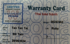 THẺ BẢO HÀNH CHÍNH HÃNG RUBY Sản phẩm / Product Ziconia Số thẻ / Card No. 05247462 Tên / Name Tào Tấn Tài Phòng khám / Clinic BS Tiên Labo / Lab Ruby Số Răng R17 Gía trị đến / Valid to 28/05/2034 Xuất sứ Nhật