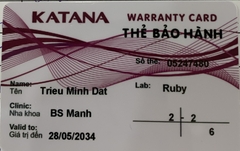 THẺ BẢO HÀNH CHÍNH HÃNG RUBY Sản phẩm / Product Katana Số thẻ / Card No. 05247480 Tên / Name Triệu Minh Đạt Phòng khám / Clinic BS Mạnh Labo / Lab Ruby Số Răng R12-22 R36 Gía trị đến / Valid to 28/05/2034 Xuất sứ Nhật