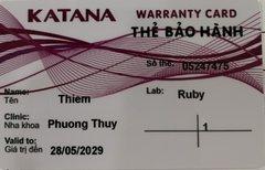 THẺ BẢO HÀNH CHÍNH HÃNG RUBY Sản phẩm / Product Katana Số thẻ / Card No. 05247475 Tên / Name Thiêm Phòng khám / Clinic NK Phương Thúy Labo / Lab Ruby Số Răng R21 Gía trị đến / Valid to 28/05/2029 Xuất sứ Nhật